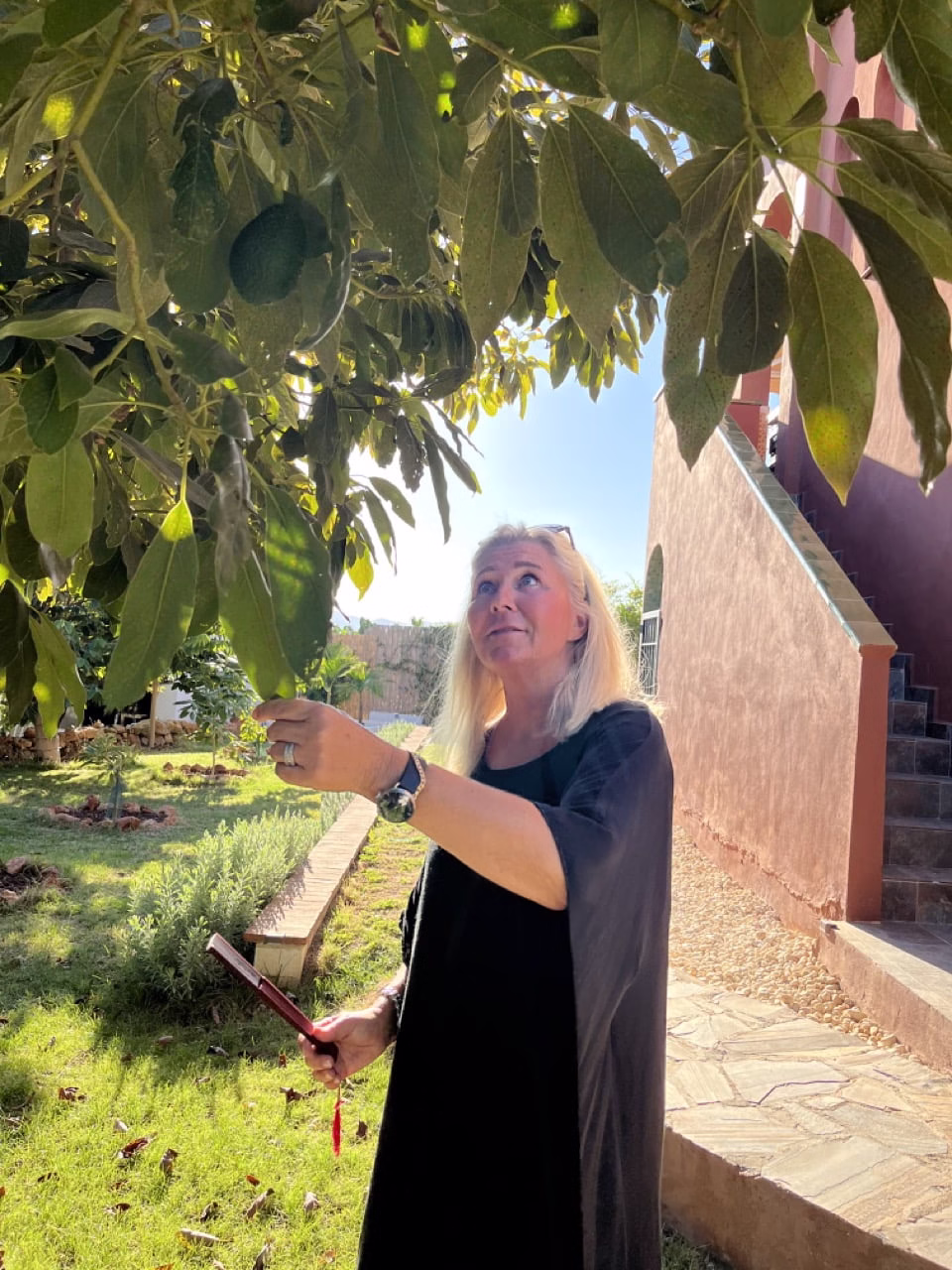 Stoltheten när hon berättar om sin trädgård och trädet Moringa som är världens nyttigaste träd, går att ta på. Av trädets blad gör hon nyttiga små shots till frukosten åt sina gäster och låter oss smaka på bladen som är tunna och vackra och smakar gott.
