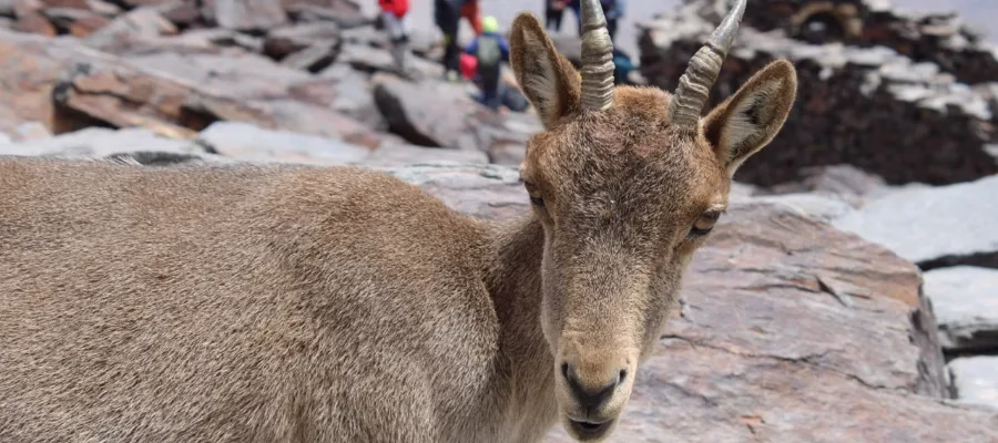 Vid en lättare lunch på toppen blir en bergsget stående två meter framför mig. Jag bjuder på morötter. Geten blir glad och vi blir bästa kompisar…