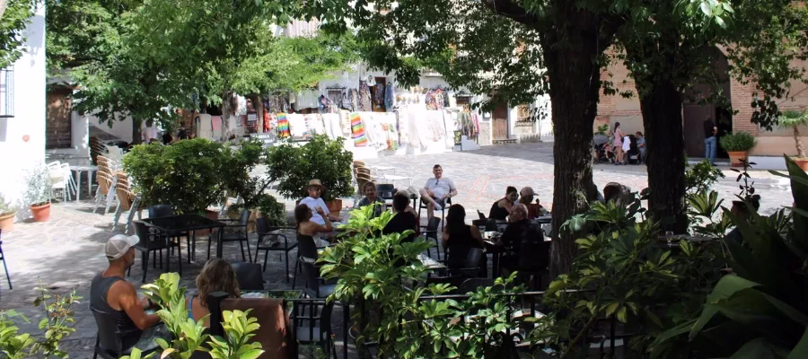På det lilla torget Plaza de la Libertad i Pampaneira sitter turister, besökare och vandrare från olika länder. Det är unga par, barnfamiljer och äldre. Amerikanska, italienska, franska och norska blandas med olika spanska dialekter.