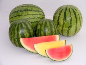 Melon som är en ettårig klängväxt växer i växthus Vattenmelonen (1) eller Sandia Negra och Sandia Crimson Sweet som de två olika sorterna heter på spanska, finns med kärnor eller utan kärnor. Sandia har antingen gult eller rött kött och skördas i provinsen Almeria i april, maj och juni.
