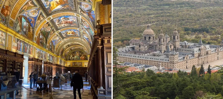 Det betraktas som El Escorials stora skatt med 14 000 böcker och manuskript. Det är Spaniens och ett av världens vackraste bibliotek med ett sagolikt tak inspirerat av Sixtinska kapellet. I klosterpalatset finns totalt 40 000 böcker. Bara en mindre del, inte ens hälften, står Escorial-slottets bibliotek.