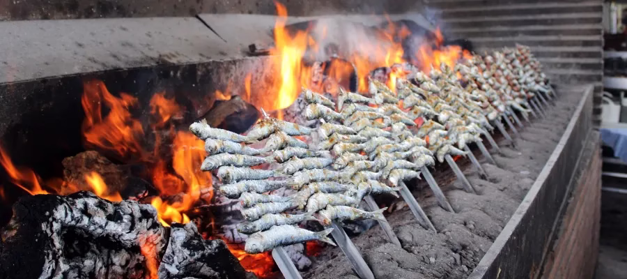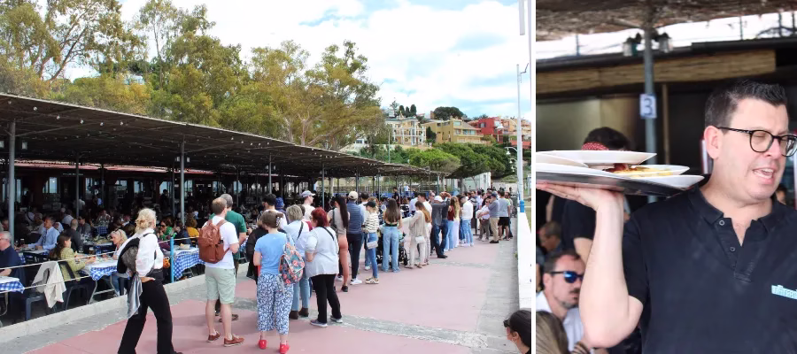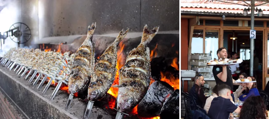 Det är främst havets frukter i form av fisk och skaldjur som bärs in på fat efter fat. Men även sallader, klyftpotatis eller kyckling. Varje fat kostar cirka 8 till 9,50 euro.