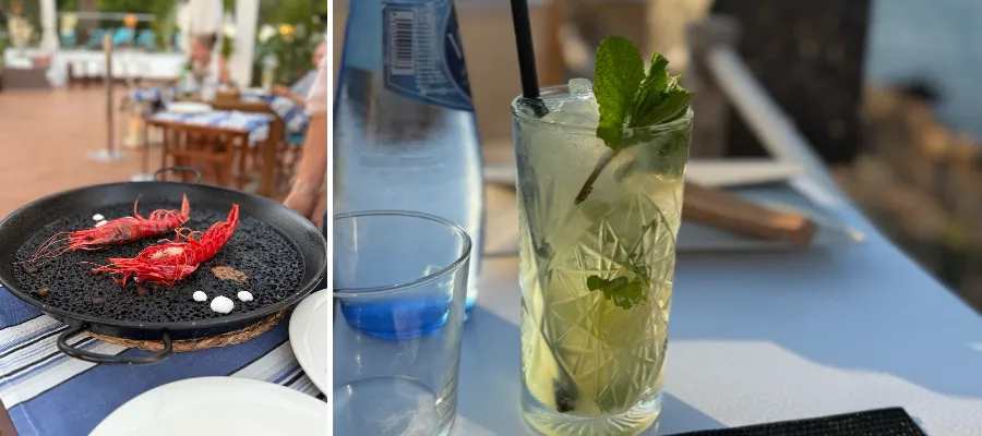 Till vänster: Restaurang Cape Nao på hotell Meliá i Cala Galdana hade ett stort utbud av färsk fisk och paella, där åt vi en klassisk svart paella med skaldjur. Till höger: Njöt av en iskall Mojito på Isabella Beach Club i vackra Fornells.