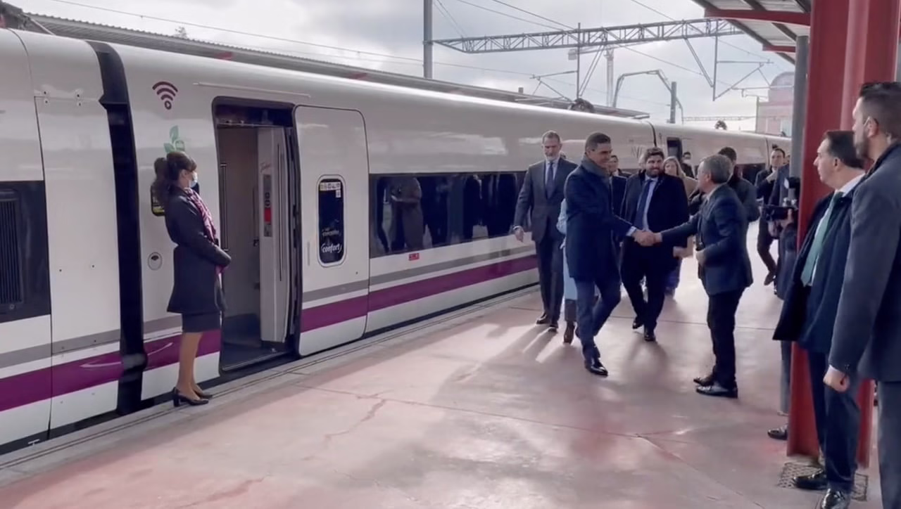Su Majestad Felipe VI y el presidente del Gobierno, Pedro Sánchez, viajan ya a bordo del AVE inaugural Madrid-Murcia. #MurciaMásCerca pic.twitter.com/PGWtJYq5lA