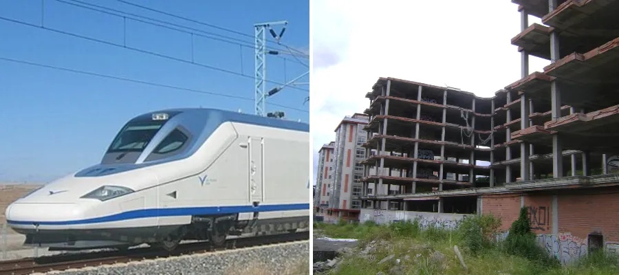 Under 1990-talet förbättrades Spanien på flera sätt. Infrastrukturen byggdes ut. Bland annat med snabbare tåg som AVEs Talgo 350. Under krisen på 2000-talet slutade nya bostäder att byggas. Ibland mitt under pågående arbete. Som här i A Coruña.