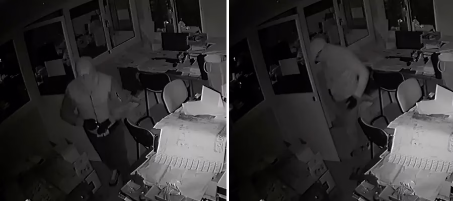 Övervakningsbilder från en kamera visar hur två maskerade personer tar sig in i lokalen strax före midnatt sent i lördags kväll.