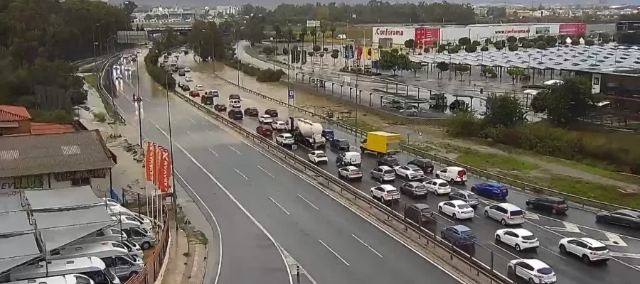 Tillfartsvägarna runt Málaga upplever på tisdagsförmiddagen stora köer då vattensamlingar stoppar upp trafiken.