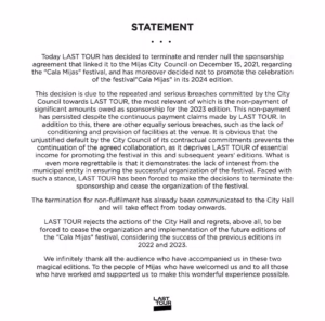 Det blir ingen Cala Mijas 2024. Arrangören Last Tour har meddelat att festivalen ställs in och att kontrakten de haft med Mijas kommunfullmäktige sedan 2021 sägs upp.