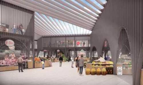 Den nya saluhallen med naturligt ljus blir på två plan där bottenplan blir helt öppen med ett torg i mitten och butiker längs sidorna.