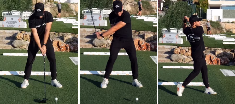 Din avslutningsposition kommer att se annorlunda ut beroende på vilken klubba du använder. Med järnklubbor tenderar spelare att avsluta längre fram mot målet, medan drivern oftare leder till en avslutning där kroppen lutar något bakåt från målet. Notera dock att i båda fallen ska kroppen fortfarande vara roterad genom slaget. Vi vill inte “hänga kvar” på bakre foten – lutningen hjälper bara klubban att träffa bollen senare i svingen.