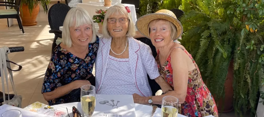 Döttrarna Britt, till vänster, och Anita, till höger, i mitten Gunborg Hallgren när hon fyllde 99 år. (Foto: Privat)
