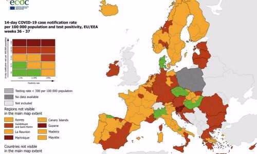 Bildtext: ECDC (Europeiskt centrum för förebyggande och kontroll av sjukdomar) publicerar varje vecka en karta över smittspridningen i EU-länderna.