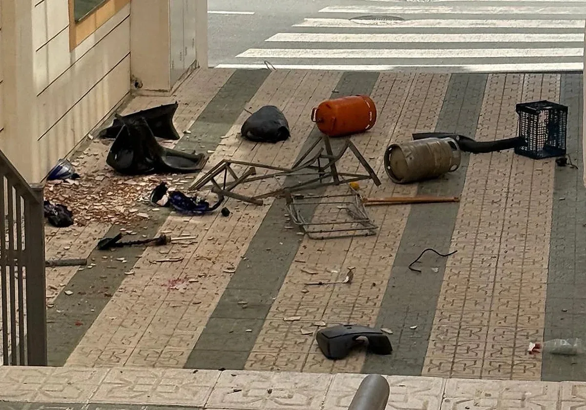 Det var två butangasbehållare, motorcykeldelar, keramikplattor, tegelstenar, stolar, trädetaljer och en större metallkonstruktion som hamnade på gatan.