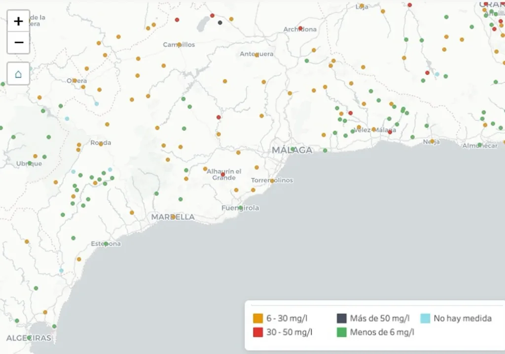 För ett dussintal kommuner i Málagaprovinsen är situationen oroande med kritiskt höga halter av nitrat som anses riskabelt. Nio av dessa redovisar nitratkoncentrationer på mellan 30 och 50 mg/l som är ett tröskelvärde.