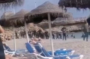 Vid 17-tiden på torsdagen när badgästerna solade som bäst anlände en snabbgående motorbåt och dumpade 33 båtflyktingar från Nordafrika i svenskparadiset Nerja.