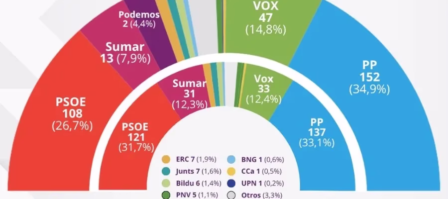 I undersökningen får liberalkonservativa Partido Popular 34,4 procent av rösterna vilket skulle ge 149 mandat i kongressen. Det är en ökning med 12 mandat jämfört med valet i juli 2023.