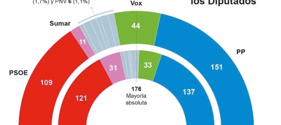 Det betyder att PP+Vox skulle få 195 eller 196 mandat tillsammans. Absolut majoritet är vid 176 mandat.