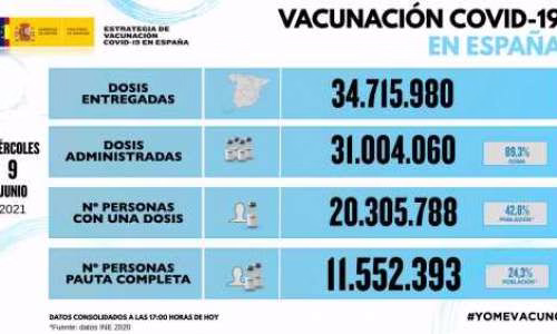 Allt fler vaccineras i Spanien. När det nationella nödläget hävdes hade 28 procent av befolkningen (13.271.511 personer) mottagit en dos medan 12,6 procent (5.956.451) hade fått två doser.