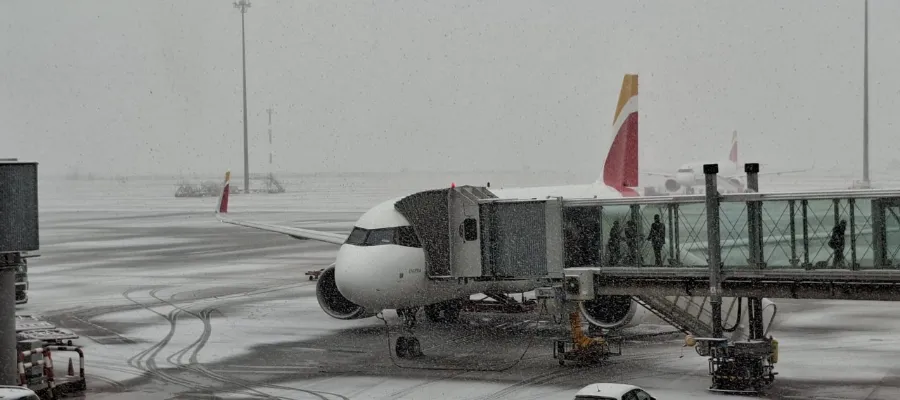 Även flygtrafiken har drabbats vid Barajas-flygplatsen. Markpersonalen har röjt snö från rullbanor och avisat flygplansvingar.