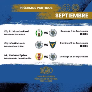 På söndag den 11 september klockan 19 möter Vélez Atletico Mancha Real från Jaén.
