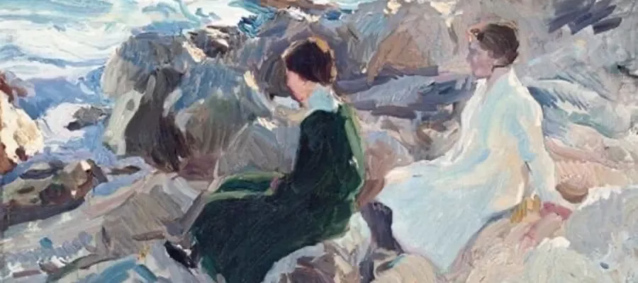 Ett av konstverken heter ”La Caleta” där Sorollo porträtterade sin fru Clotilde med dottern Elena framför några klippor längs den kände Málagakusten.