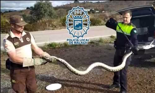 Málagapolisen har fångat en tre meter lång tigerpyton som befann sig bland vegetationen bara några meter från landsväg MA-3111 mellan Olías och Colmenar strax norr om Málaga.