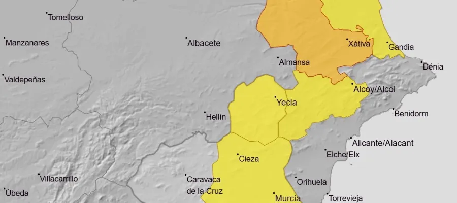 Regionregeringen har aktiverat orange vädervarning det kommande dygnet i Valenciaprovinsens inland och gul varning i stora delar av övriga regionen. Det gäller bland annat Alicanteprovinsens inland.