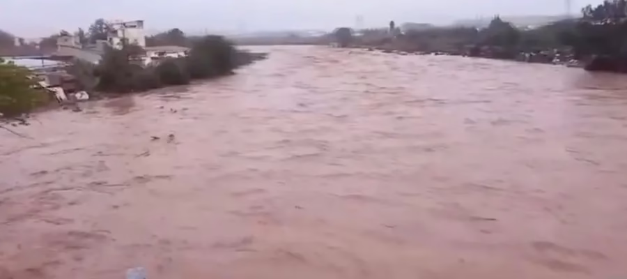 Floden Turia vid Paiporta (Valencia) på väg att svämma över.