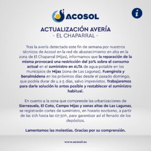En vattenläcka i en större vattenledning vid El Chaparral i Mijas Costa kommer att ge avbrott i vattenleveransen till bostadsområden som La Sierrezuela, El Coto, Campo Mijas och övre delen av Las Lagunas från klockan 21 och till morgonen.