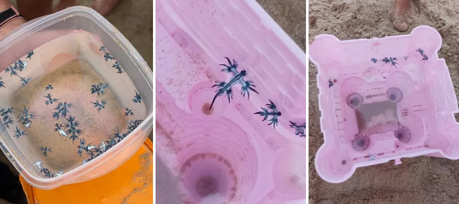 La aparición de ejemplares del Dragón Azul (Glaucus atlanticus) se sigue produciendo. Hoy ya son muchos más los ejemplares que se han recogido tal y como vemos en estas imágenes que nos envía Estefanía desde Guardamar del Segura. También se han visto en la playa de La Mata. pic.twitter.com/be1ERfu3zQ