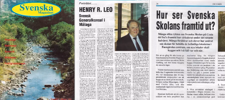 En av de större artiklarna i första numret av Svenska Magasinet i oktober 1990 handlar om Svenska skolans framtid. Vid den aktuella tidpunkten handlade det om ifall skolan kunde vara kvar i de dåvarande lokalerna på avenida Ramón y Cajal i centrala Fuengirola.
